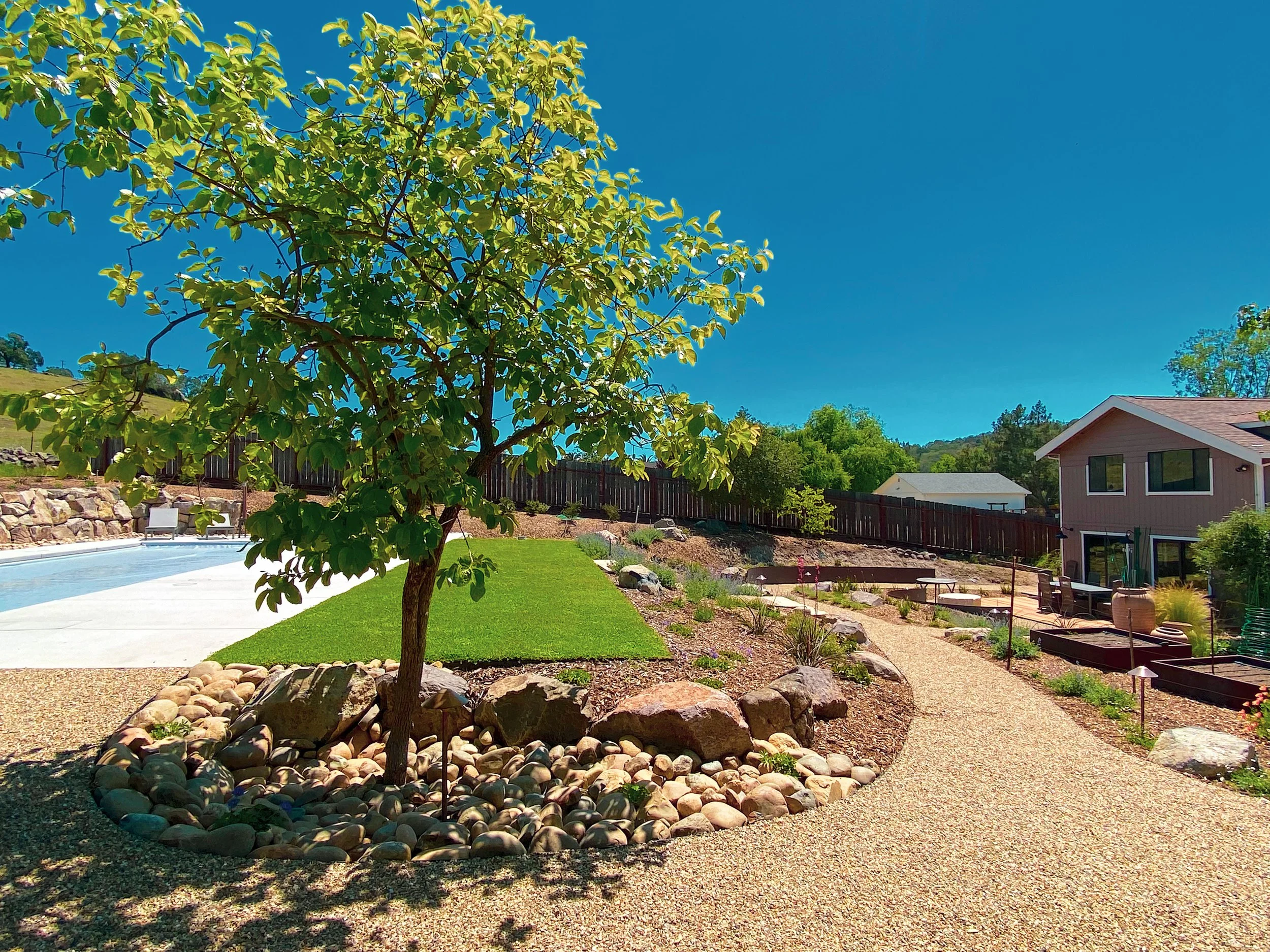 This prompted carving out a huge portion of the yard, and terracing the landscape, along with winding “ramps” for ease of access. So much much dirt started coming out that it raised some eyebrows, but it was well worth it because now they raise they eyebrows along with a WOW! The house gained immensely thanks to the new indoor - outdoor living room, new 20’ deck, views of the terraces filled with flowering pollinator species and native groundcovers for erosion control. The corten retaining walls define the walkways with clean, gentle curves that slice through the hill. Stone treads and giant boulder walls look as if they were all quarried right out of the site. if you take the Paseo to the top, it brings you to a steel blue 15x40 pool and spa that surrounded by warm rock, which invites you to dive in. And to top it all off, the view which now can be appreciated right out of the living room, showcases a view crowned with magnificient Live Oaks and Golden California Hills.